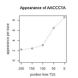 | GO ID | term | -Log(p) | number of {A; genes in a GO} | numver of {B; genes with this heptamer} | {A} x {B} |