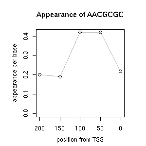 | GO ID | term | -Log(p) | number of {A; genes in a GO} | numver of {B; genes with this heptamer} | {A} x {B} |