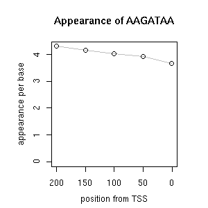 | GO ID | term | -Log(p) | number of {A; genes in a GO} | numver of {B; genes with this heptamer} | {A} x {B} |