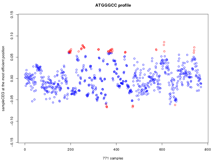 | GO ID | term | -Log(p) | number of {A; genes in a GO} | numver of {B; genes with this heptamer} | {A} x {B} |