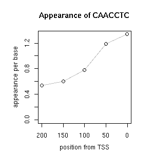 | GO ID | term | -Log(p) | number of {A; genes in a GO} | numver of {B; genes with this heptamer} | {A} x {B} |