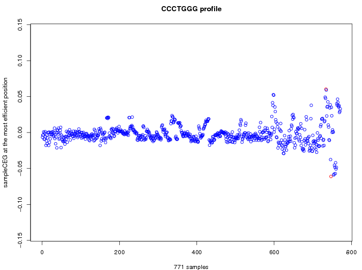 Red circles indicate absolute CEG value > 0.06. Experimental condition pop up when the mouse is over a sample of red circle.
