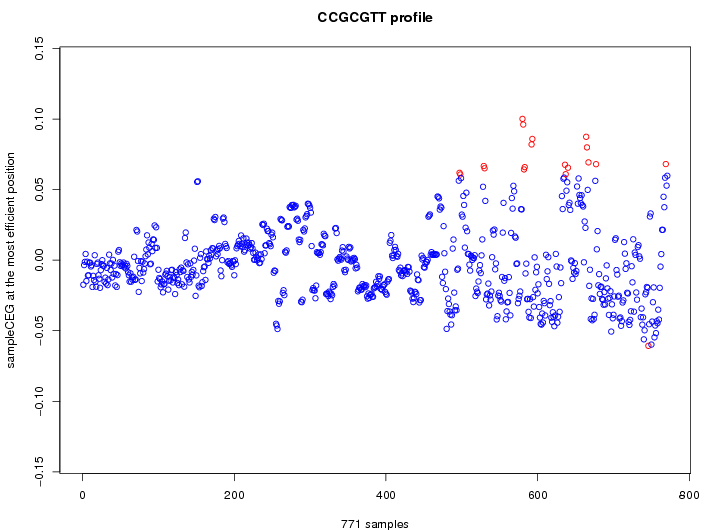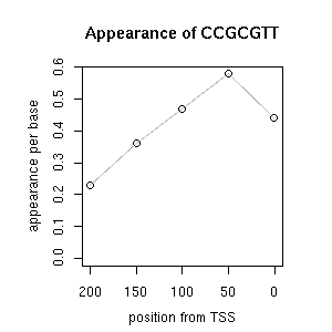 | GO ID | term | -Log(p) | number of {A; genes in a GO} | numver of {B; genes with this heptamer} | {A} x {B} |