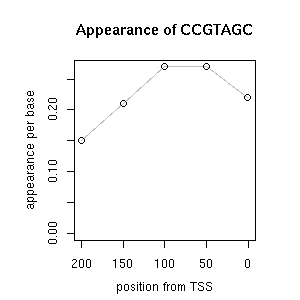 | GO ID | term | -Log(p) | number of {A; genes in a GO} | numver of {B; genes with this heptamer} | {A} x {B} |