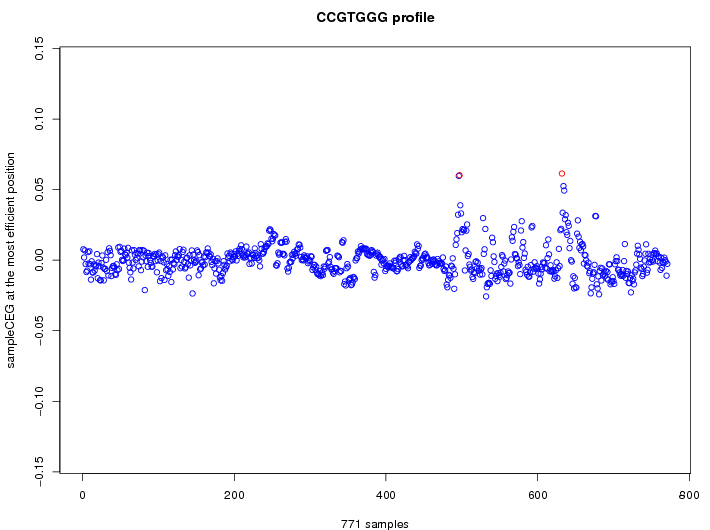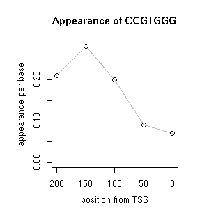 | GO ID | term | -Log(p) | number of {A; genes in a GO} | numver of {B; genes with this heptamer} | {A} x {B} |