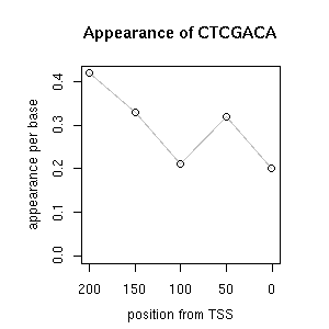 | GO ID | term | -Log(p) | number of {A; genes in a GO} | numver of {B; genes with this heptamer} | {A} x {B} |