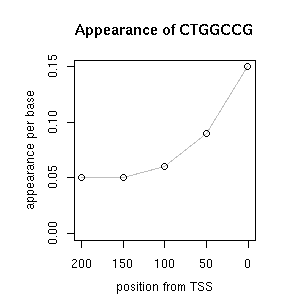 | GO ID | term | -Log(p) | number of {A; genes in a GO} | numver of {B; genes with this heptamer} | {A} x {B} |