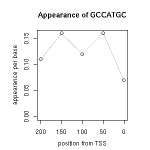 | GO ID | term | -Log(p) | number of {A; genes in a GO} | numver of {B; genes with this heptamer} | {A} x {B} |