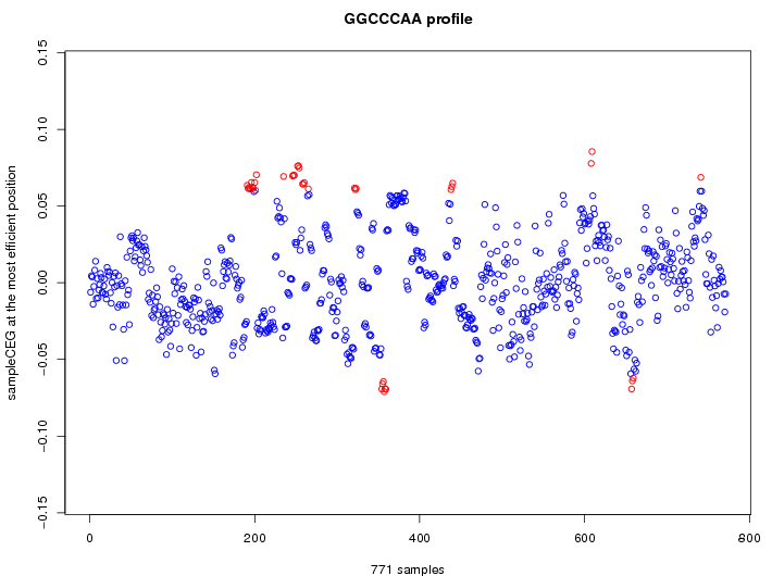 Red circles indicate absolute CEG value > 0.06. Experimental condition pop up when the mouse is over a sample of red circle.