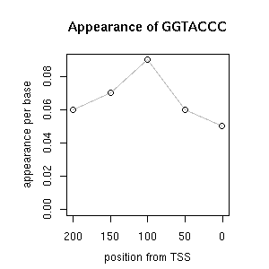 | GO ID | term | -Log(p) | number of {A; genes in a GO} | numver of {B; genes with this heptamer} | {A} x {B} |
