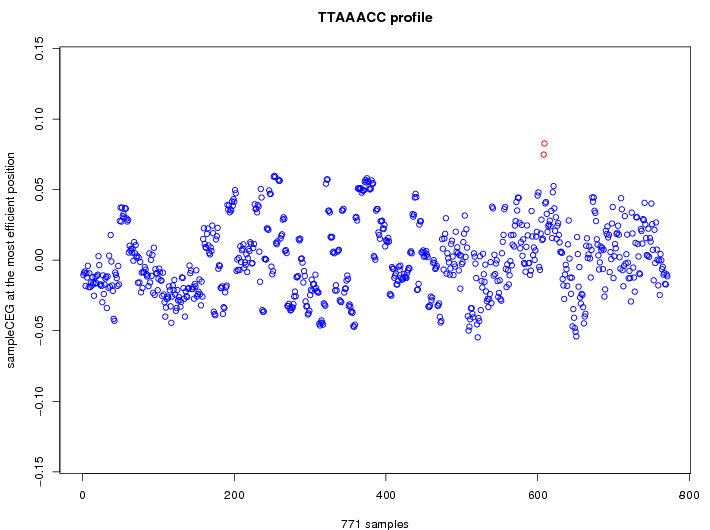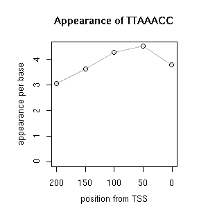 | GO ID | term | -Log(p) | number of {A; genes in a GO} | numver of {B; genes with this heptamer} | {A} x {B} |