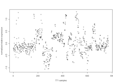 Figure 2 is the expression profile of a TF, GBF3. The 771 array samples are given on the x-axis. The y-axis is the normalized relative expression to average level of this gene.