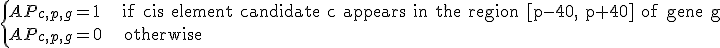 Figure A is the image of cis element appearance (APc="AACCCTA",p=41,g). The AP of genes with AACCCTA in [1, 81] region upstream of TSS is set as 1, otherwise as 0.
