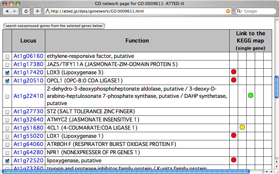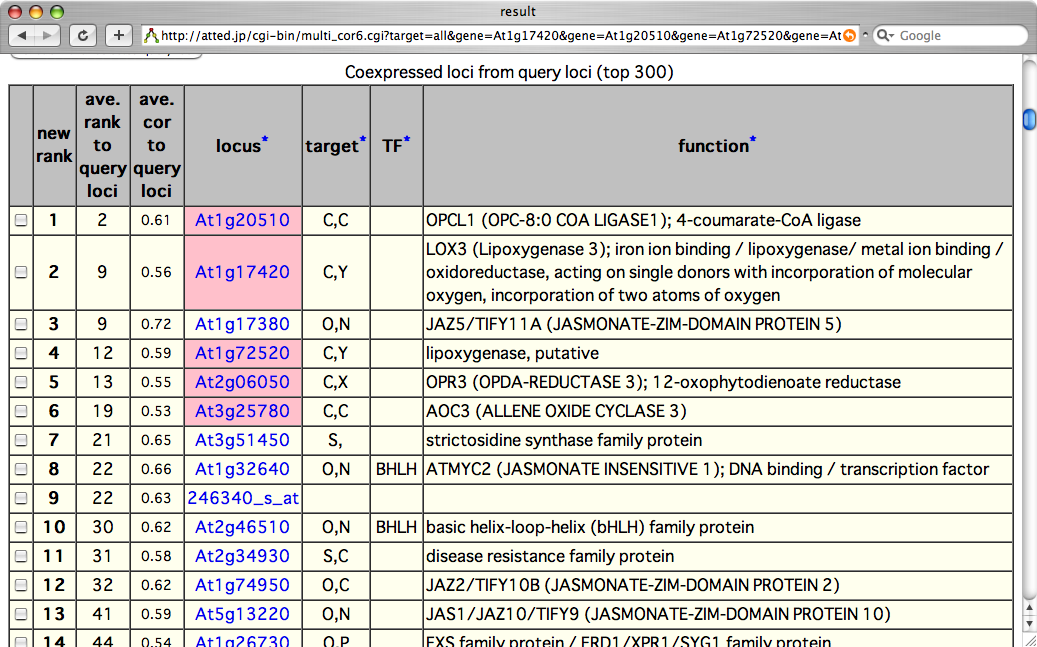 To search other genes that function with these groups of genes, check and submit the genes to search, for example the group of genes for jasmonate biosynthesis above (AOS, OPR3, OPCL1, LOX3, AOC3, lipoxgenase). Note that query genes of this search should be coexpressed.